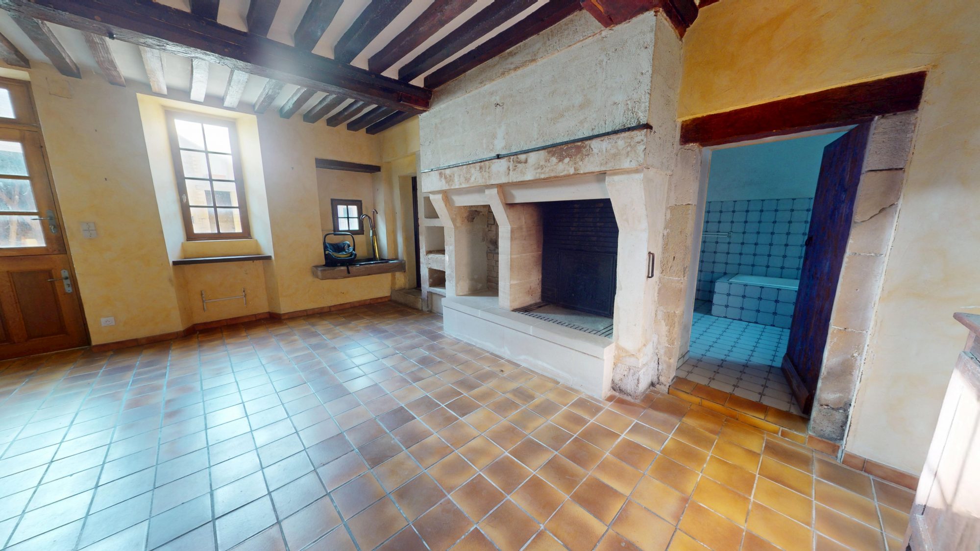 La maison se compose au rez-de-chaussée d’une entrée, d’une grande cuisine, d’un séjour avec cheminée, d’un bureau et d’une salle d’eau.