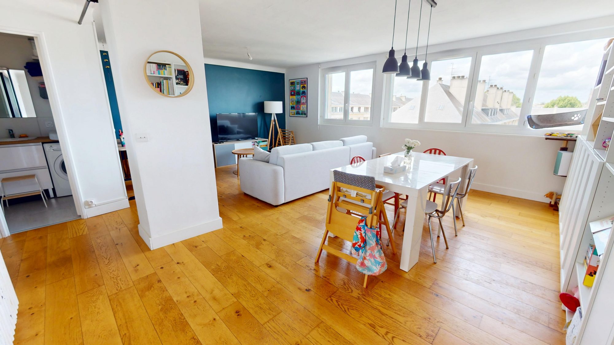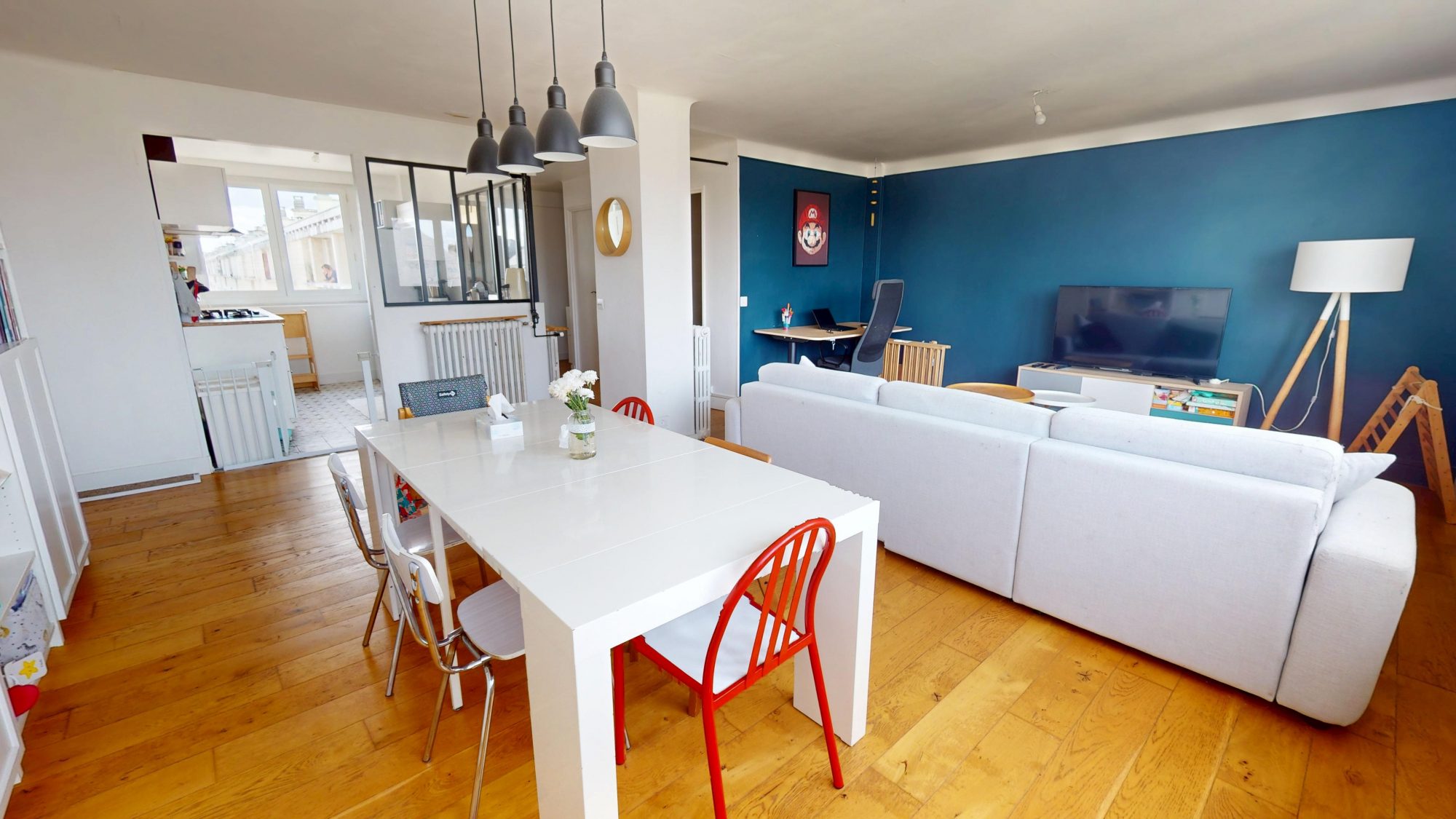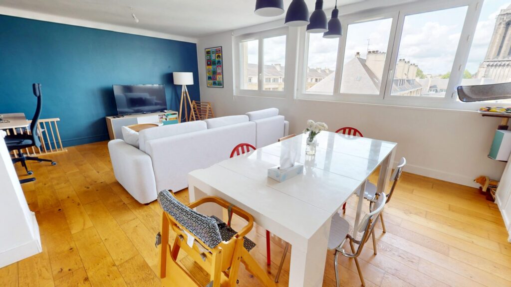 Entrée, cuisine ouverte sur la salle à manger/séjour avec vue sur l’Église Saint-Jean, deux belles chambres, une salle de bains, et WC séparés.
