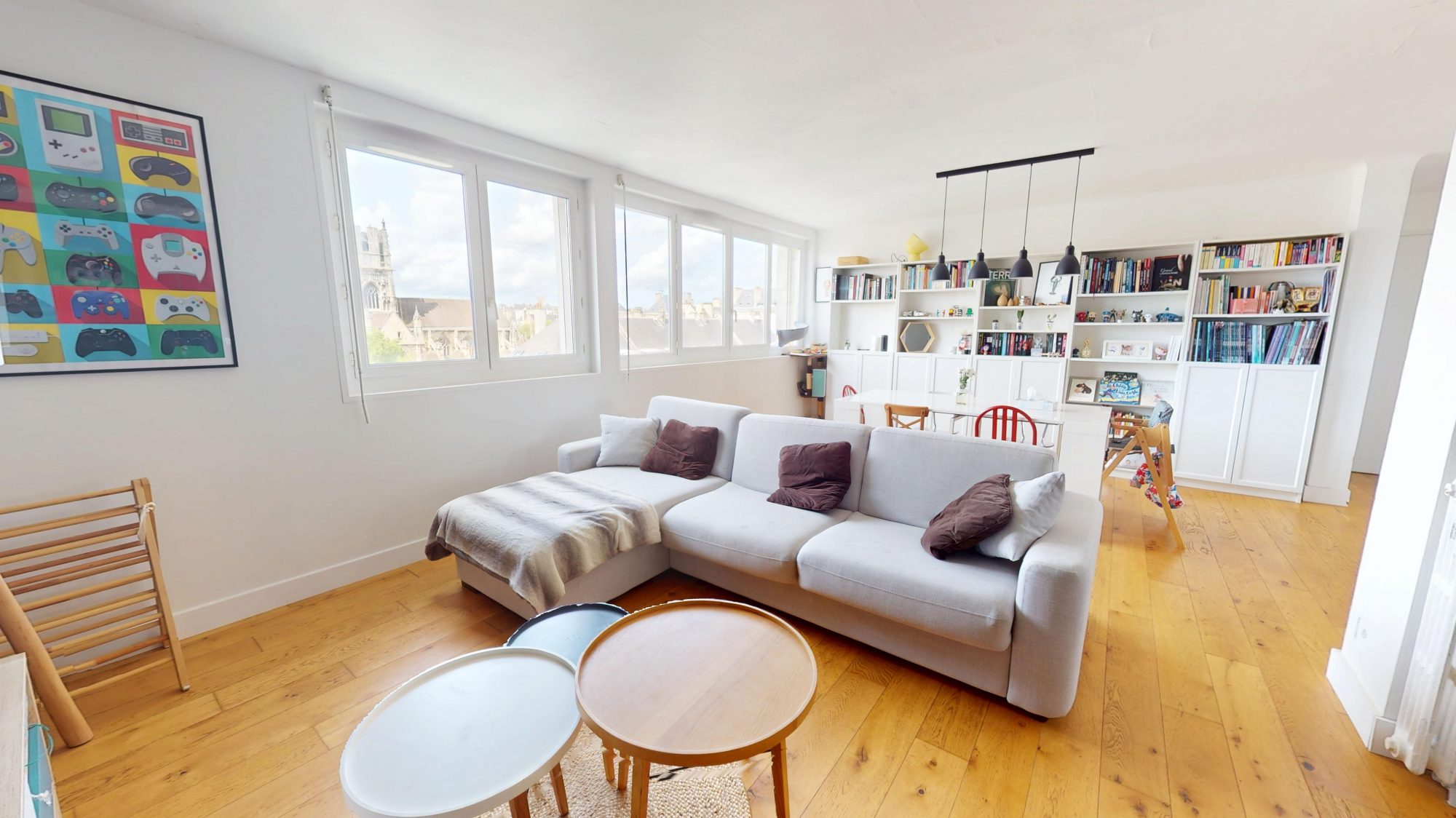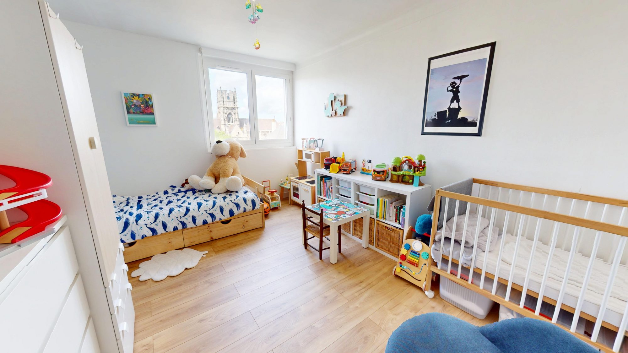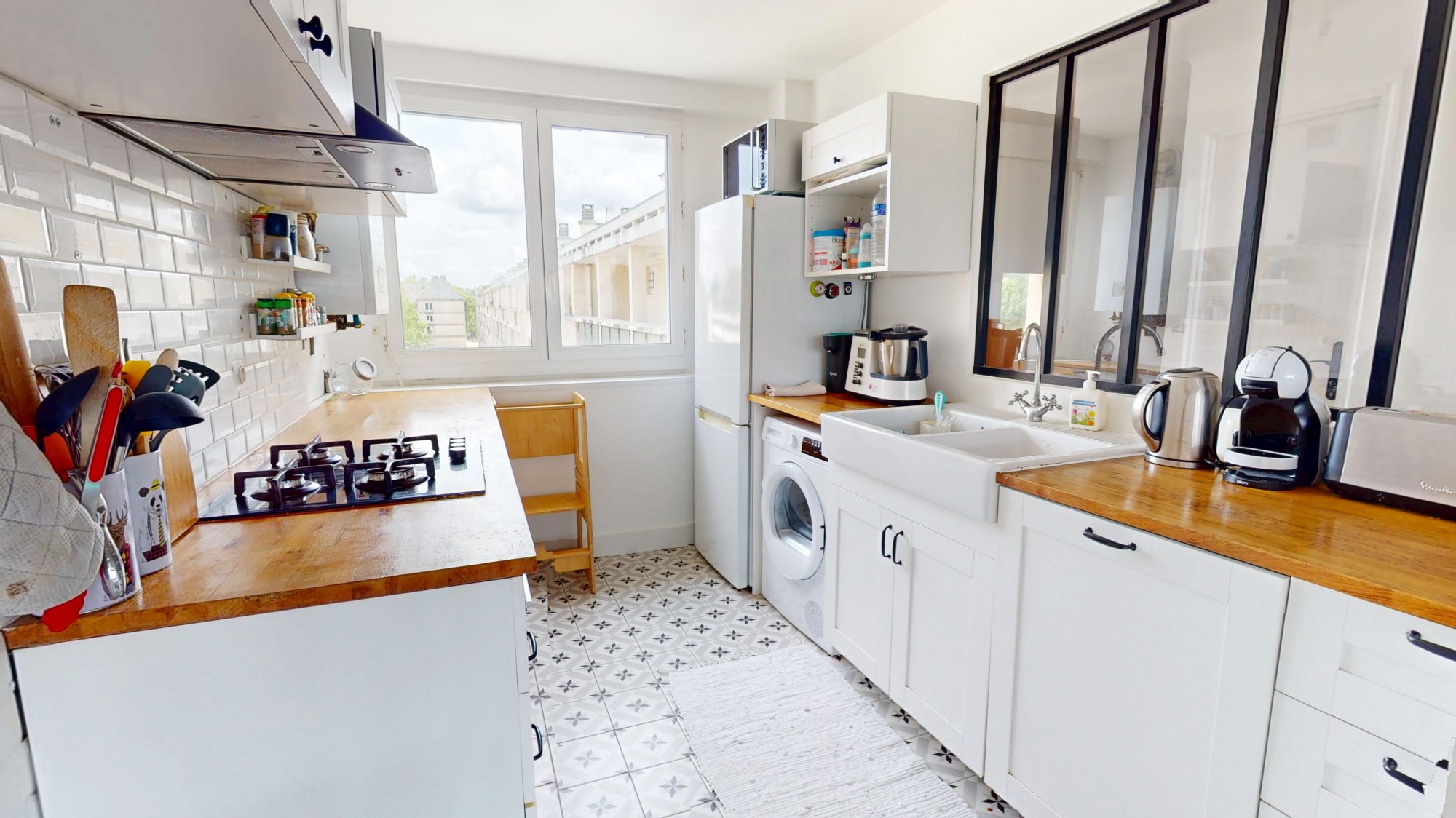 Entrée, cuisine ouverte sur la salle à manger/séjour avec vue sur l’Église Saint-Jean, deux belles chambres, une salle de bains, et WC séparés.